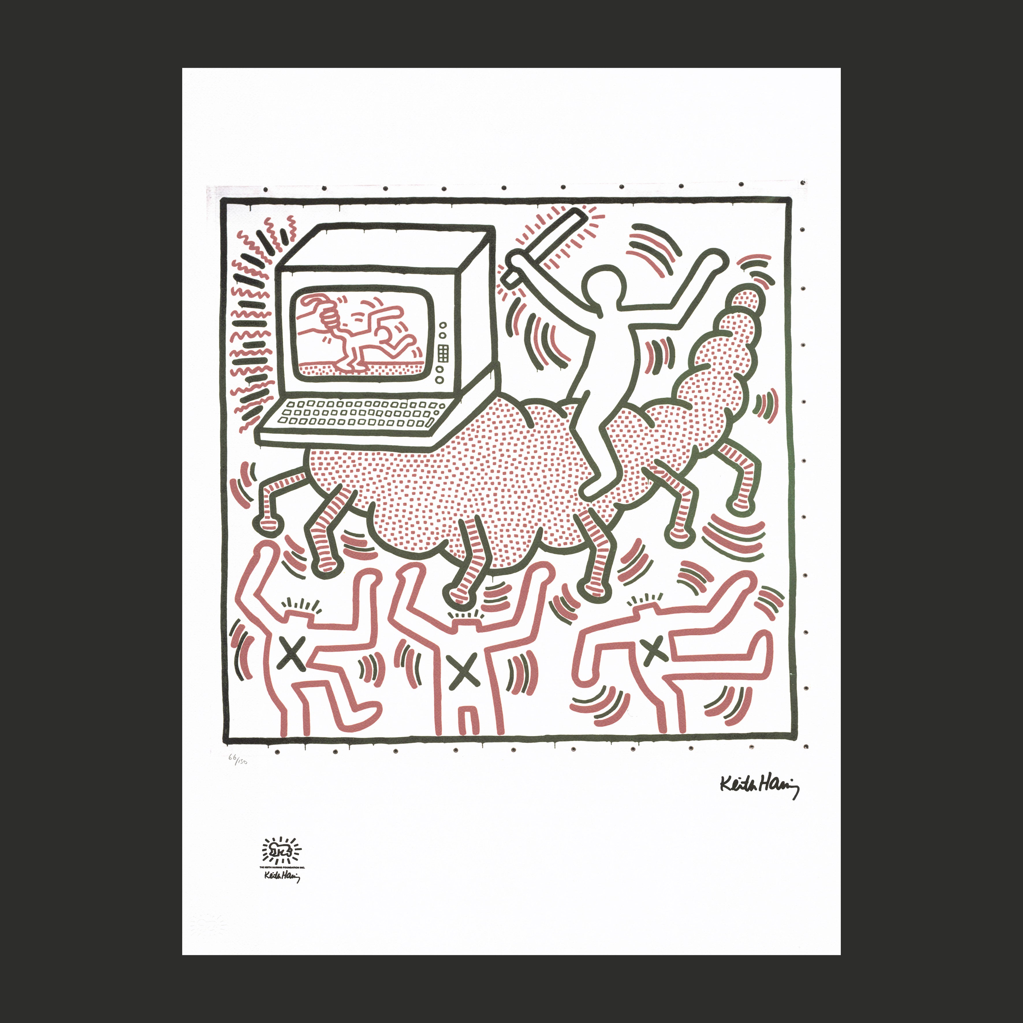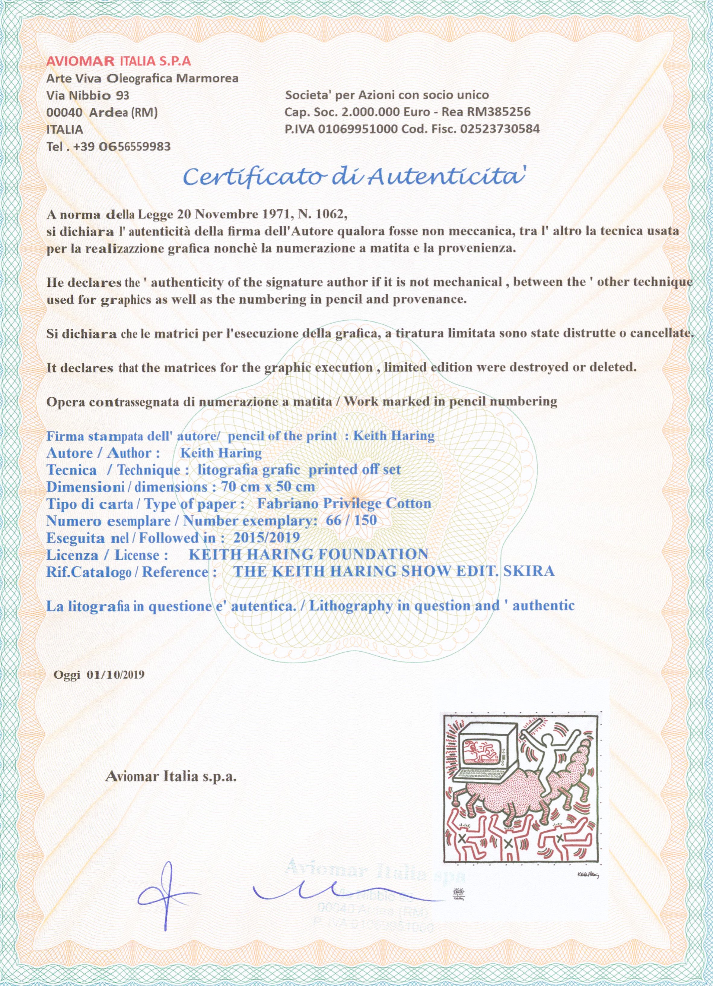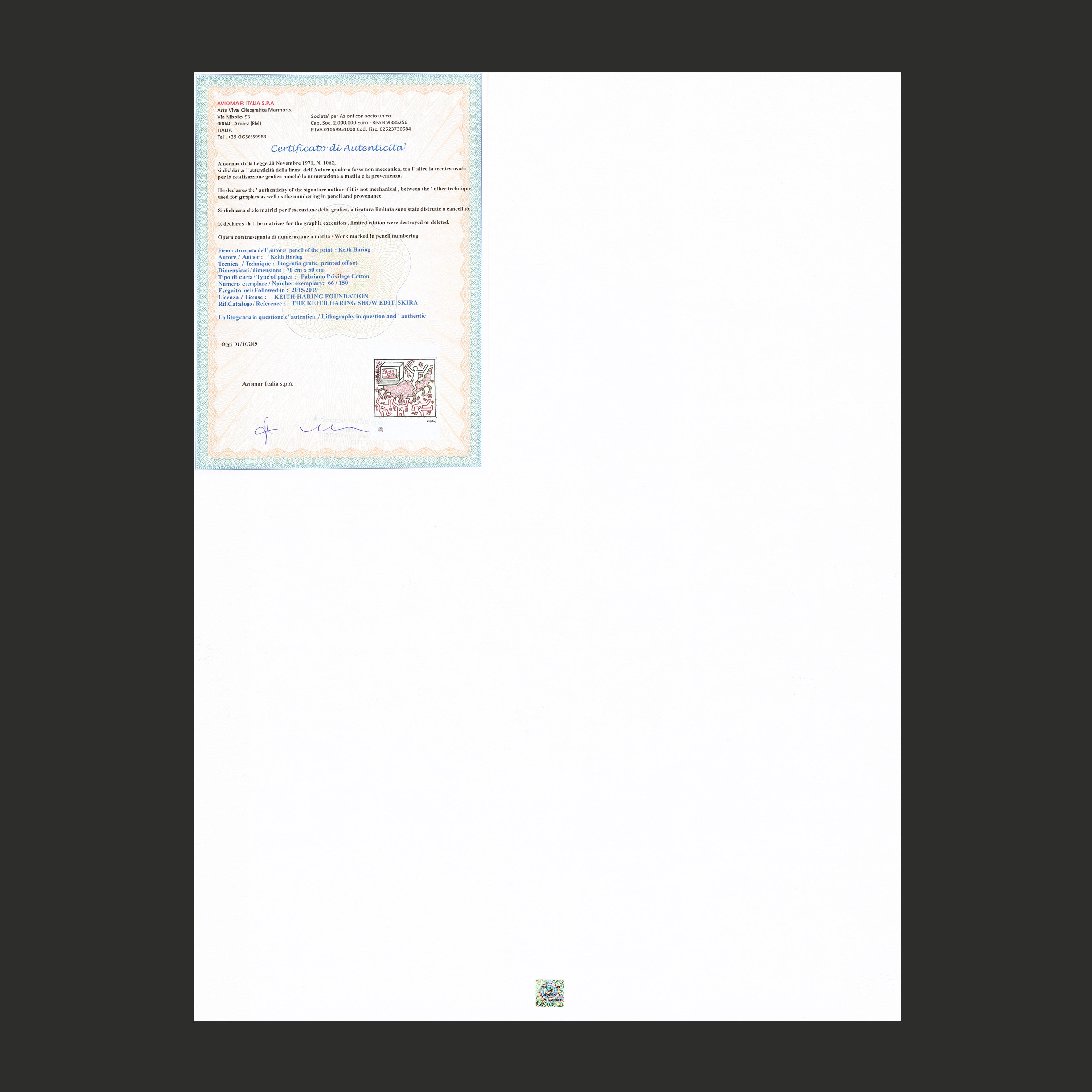 Certifikovaný grafický list, 50 x 70 cm. Číslováno 56/150. Certifikát, slepotisk a licence KEITH HARING FOUNDATION, ruční papír Fabriano Privilege Cotton. Signováno vpravo dole Keith Haring.