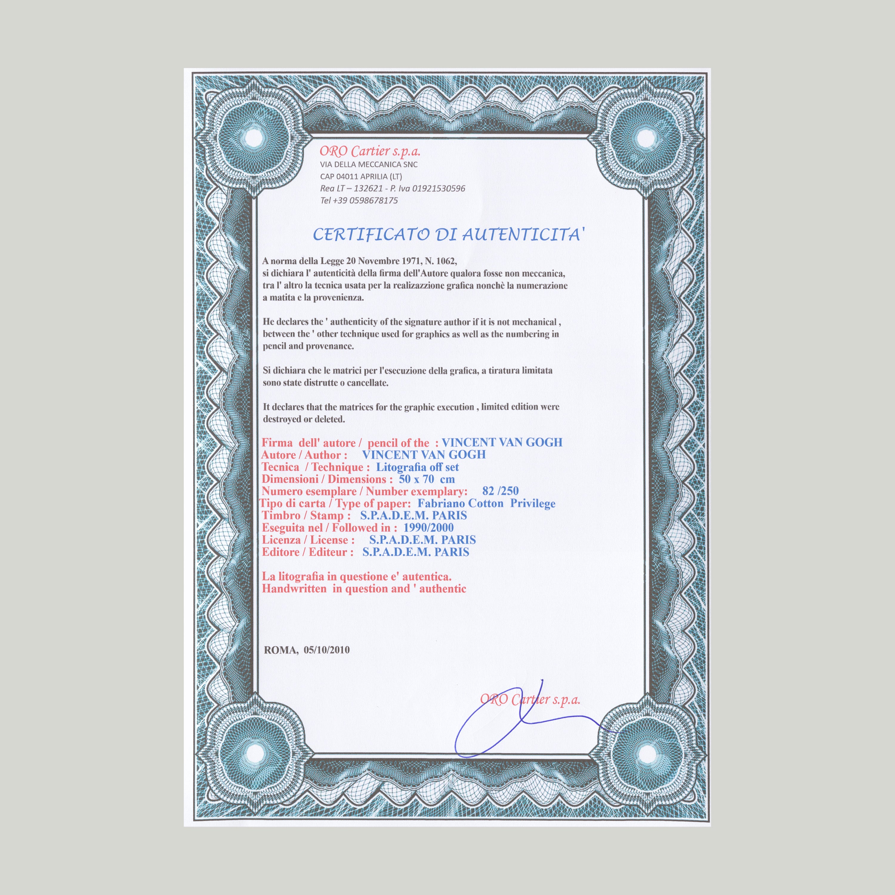Certifikovaný grafický list, 50x70 cm. Číslováno 82/250. Certifikát, ruční papír Fabriano Cotton Privilege. Signováno vpravo dole Vincent van Gogh. Slepotisk S.P.A.D.E.M. Paris. Číslováno tužkou