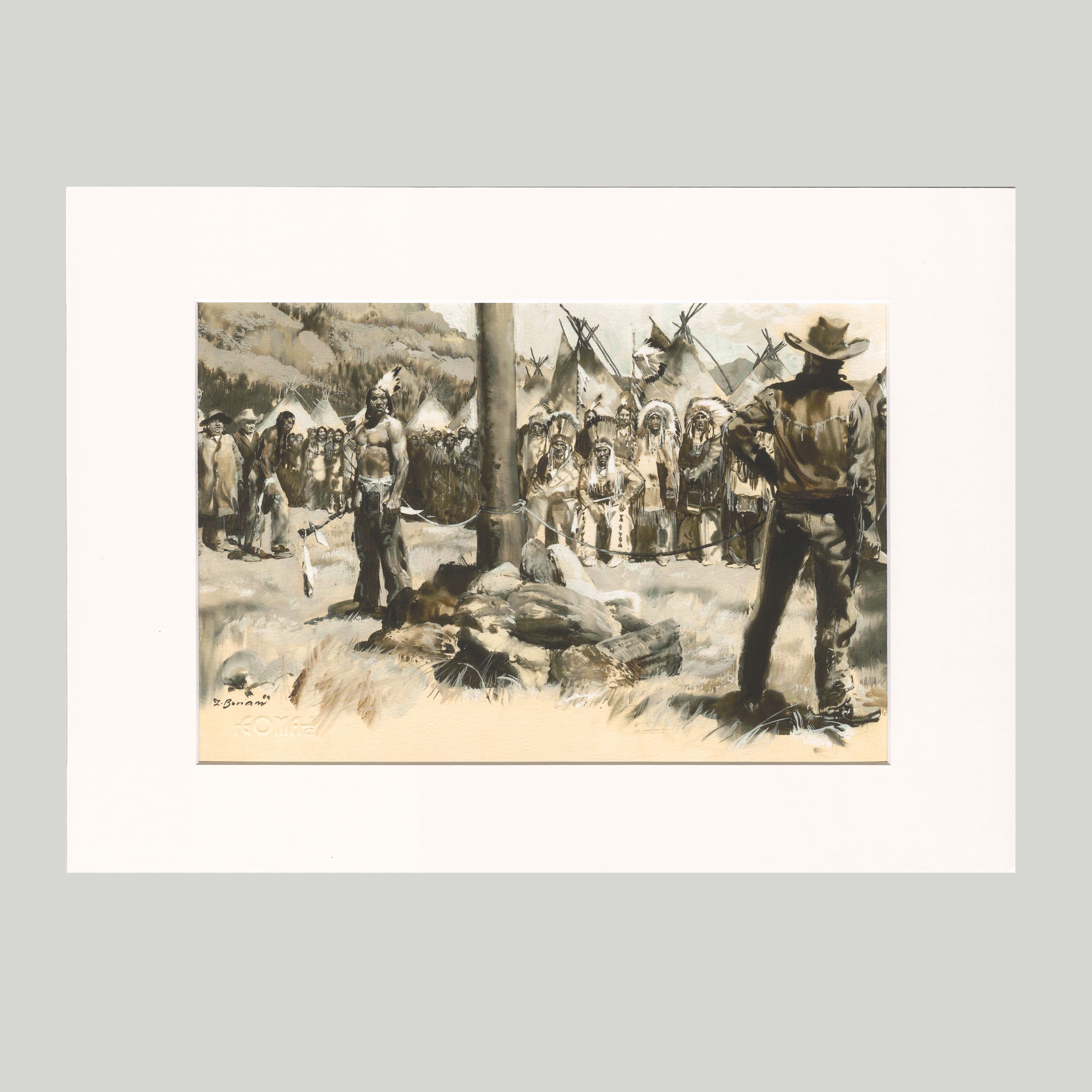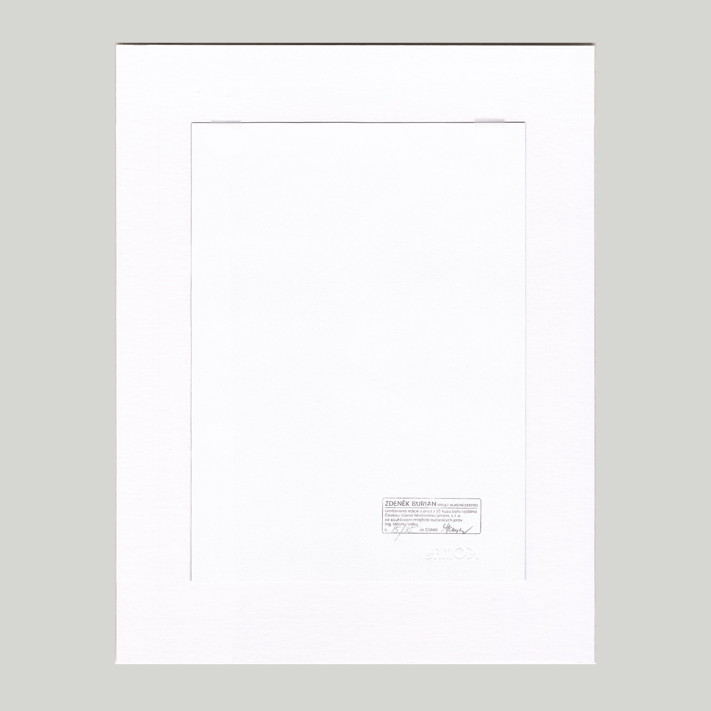 Giclée na ručním papíru, pasparta, 30x40 cm. Limitovaná edice 35 kusů vydaná u příležitosti výstavy Zdeňka Buriana v České Galerii Moderního Umění.