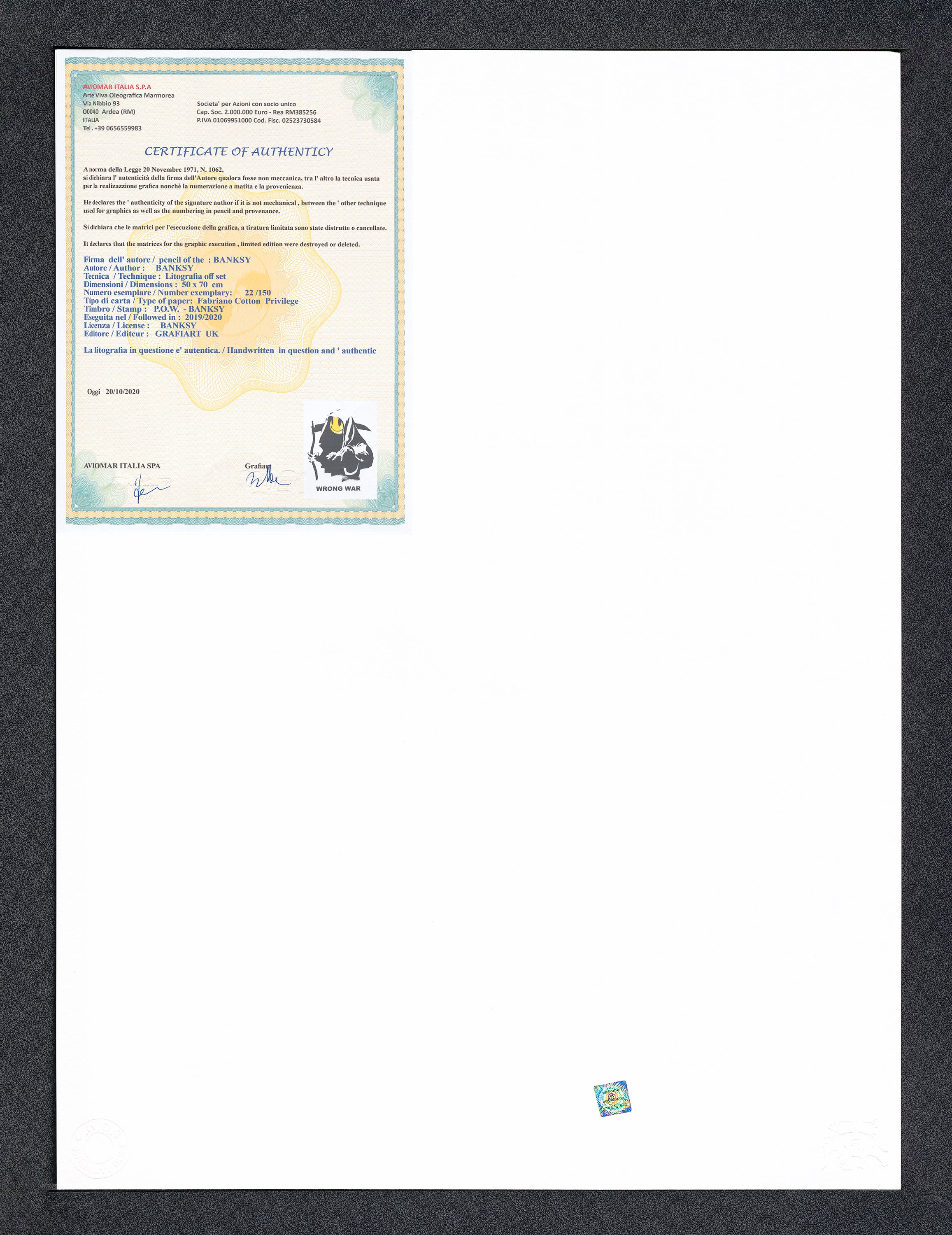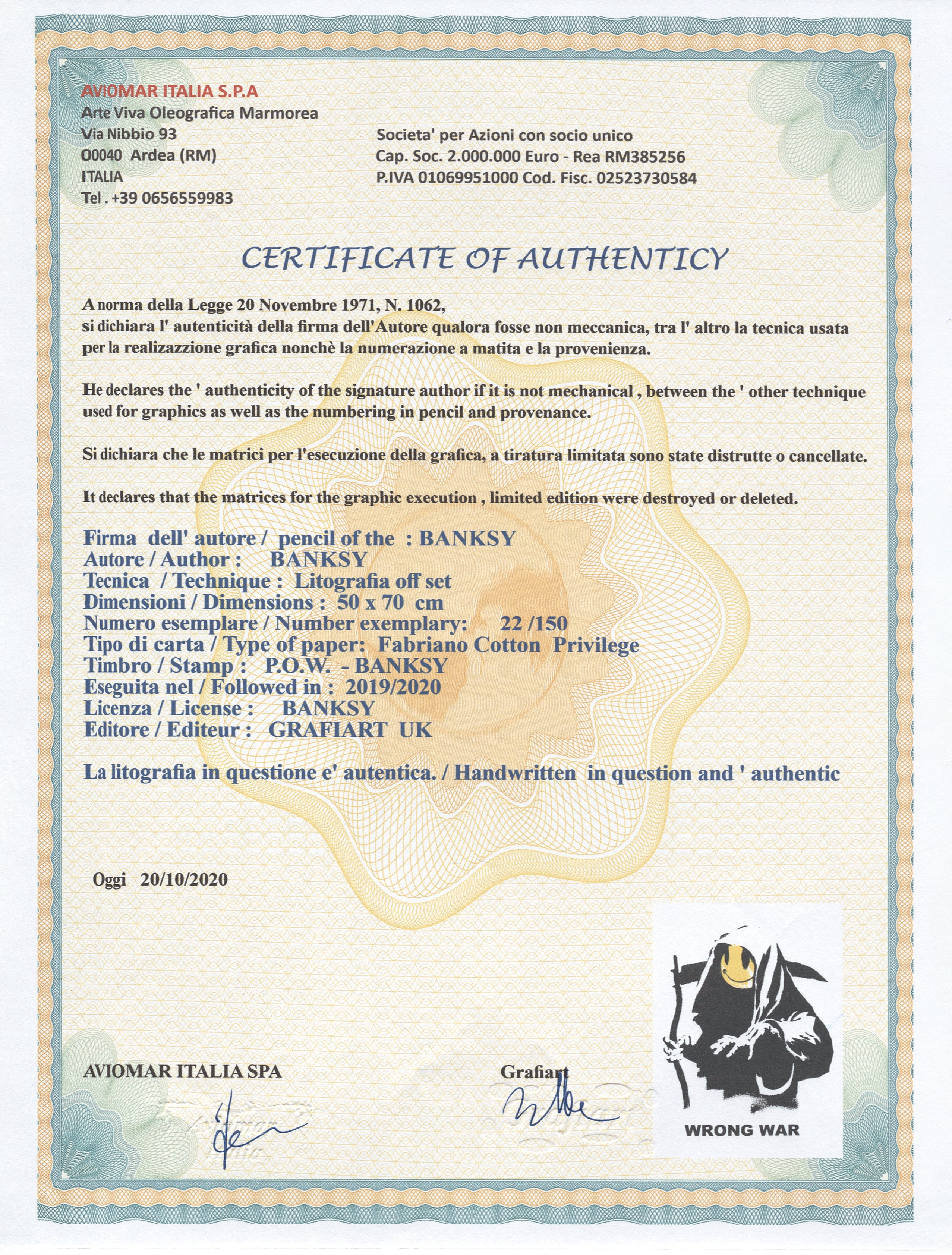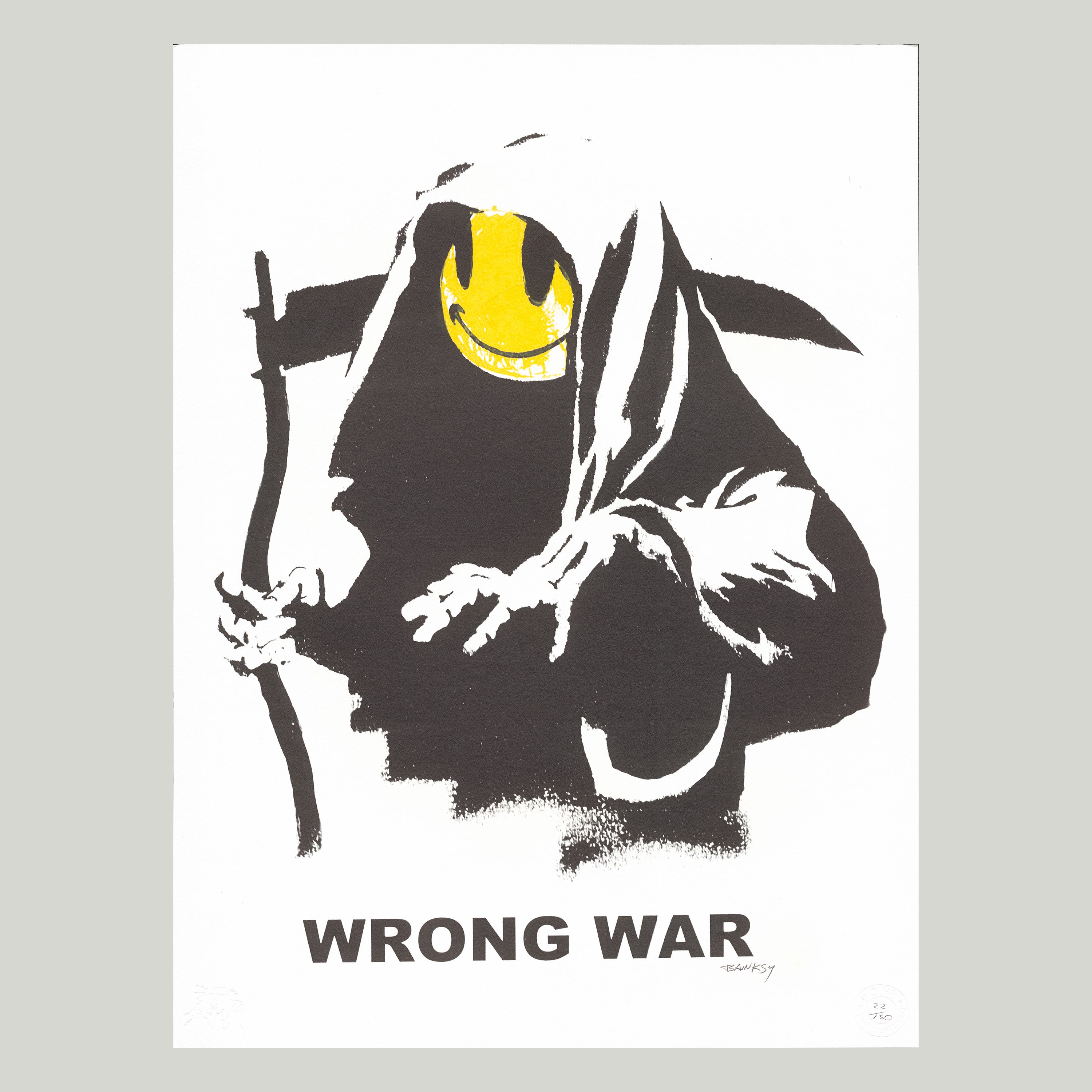 Grafický list, 50 x 70 cm. Číslováno, slepotisk P.O.W.-BANKSY, ruční papír Fabriano Cotton Privilege. Signováno vpravo dole BANKSY.
