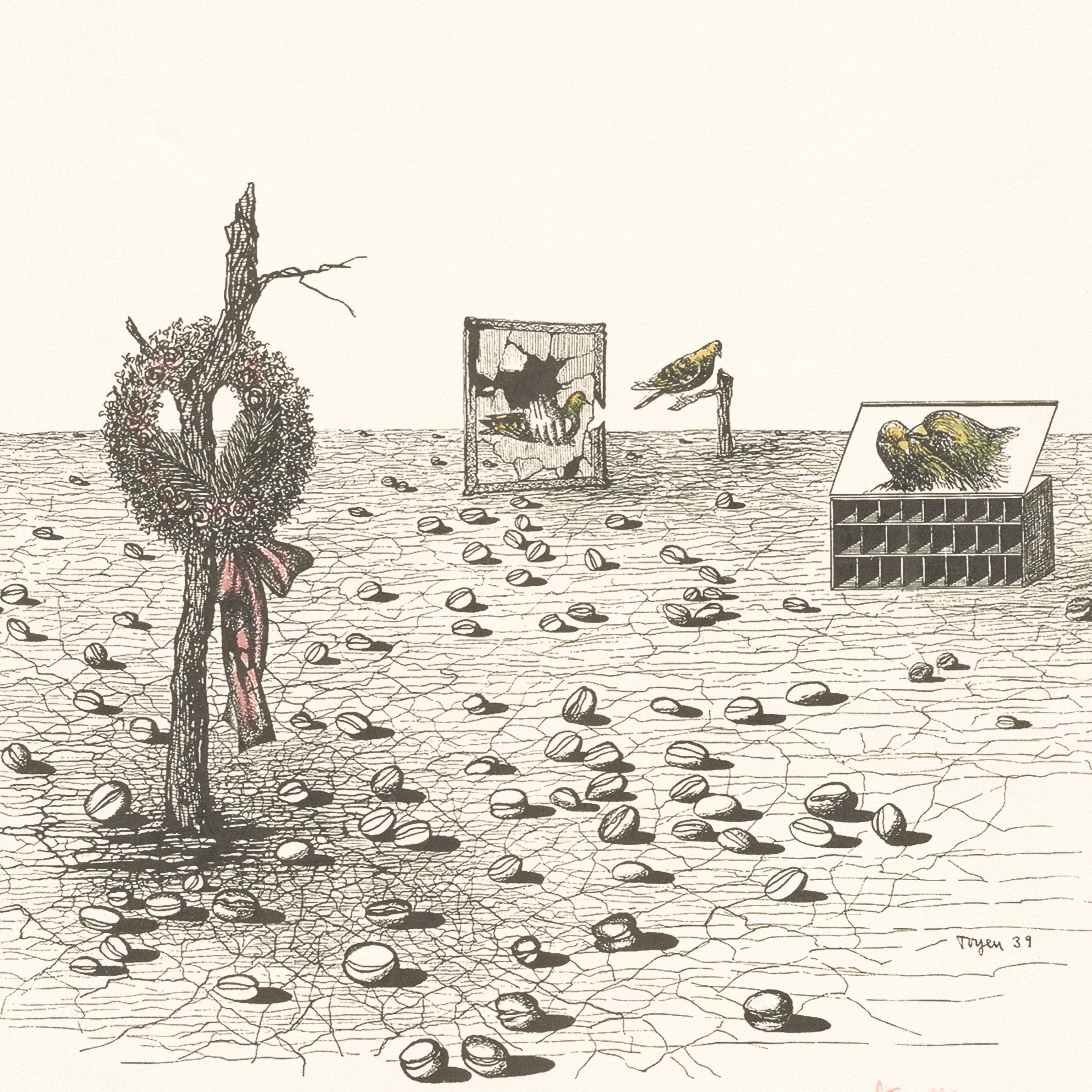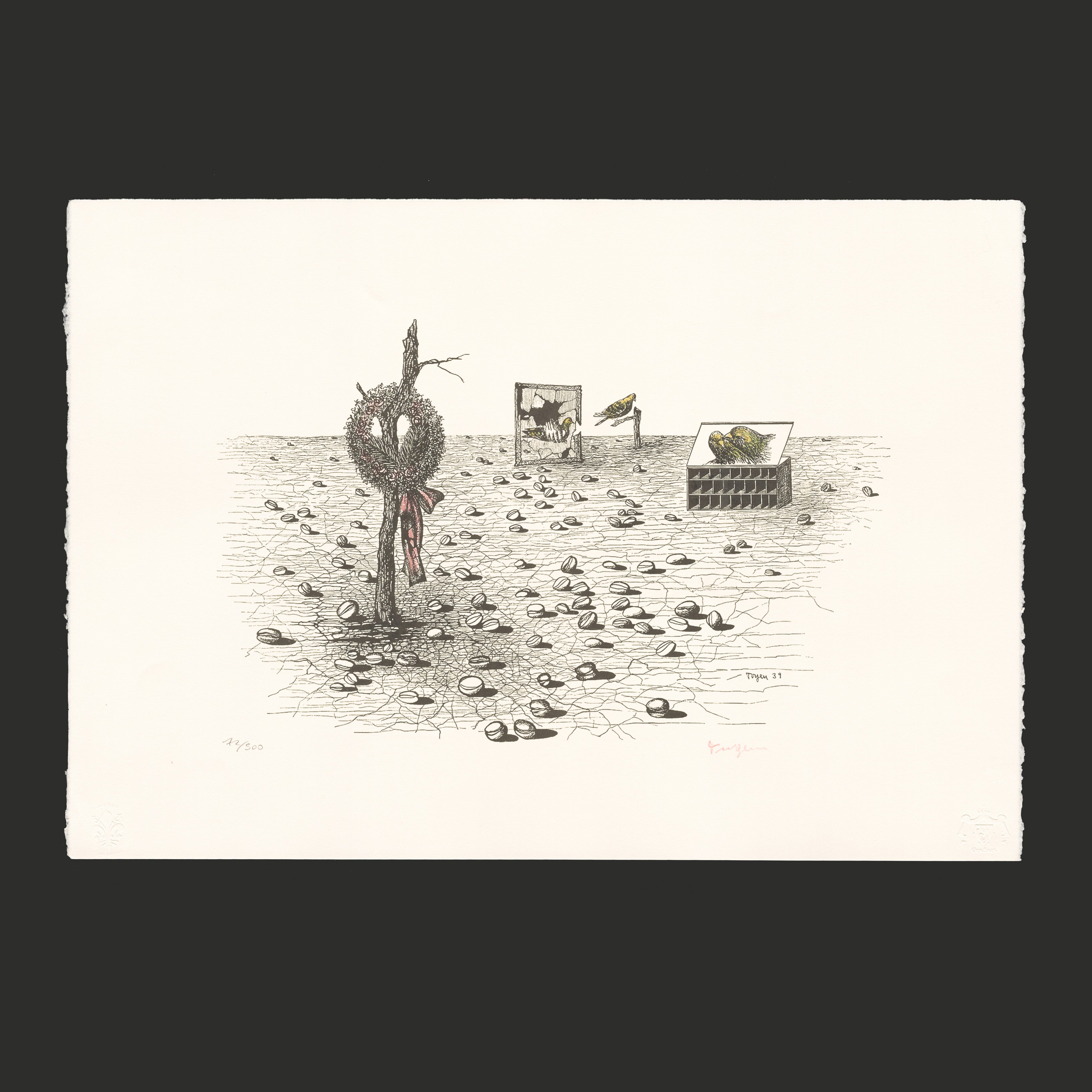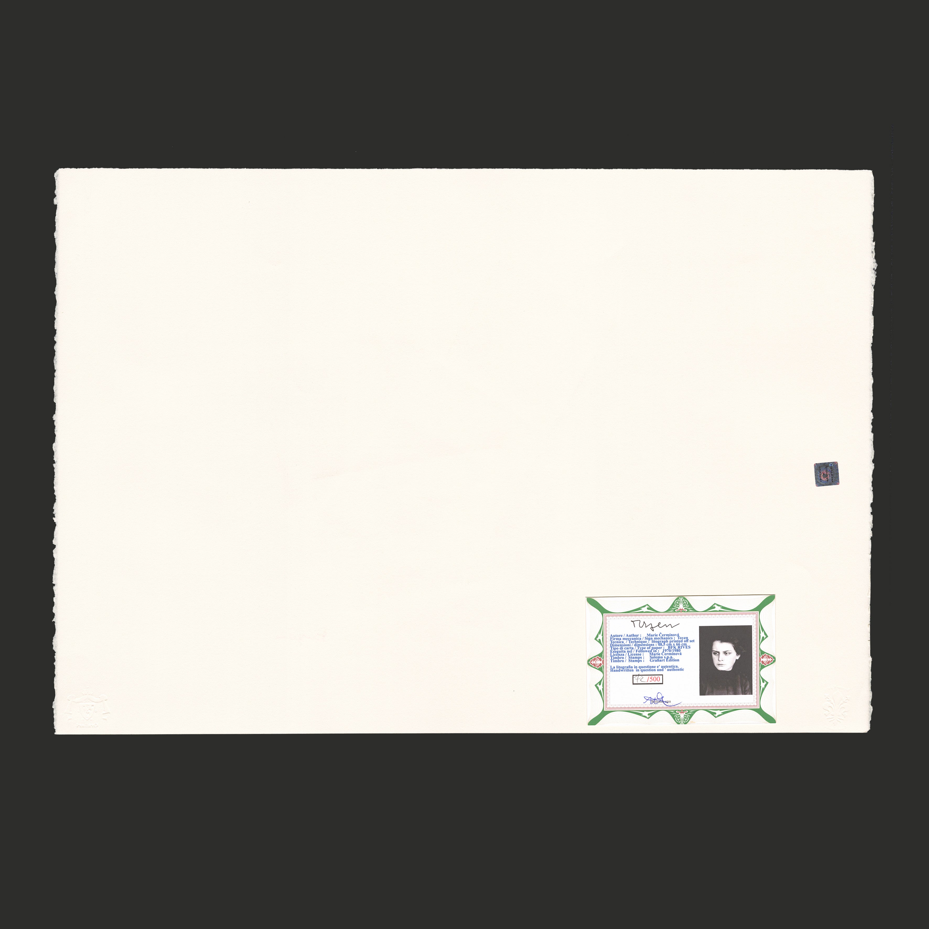Certifikovaný grafický list, 47,7 x 66,5 cm. Číslováno 72/500. Certifikát, ruční papír BFK RIVES. Signováno vpravo dole Toyen. Slepotiskové razítko: Solema s.p.a., Grafiart Edition.