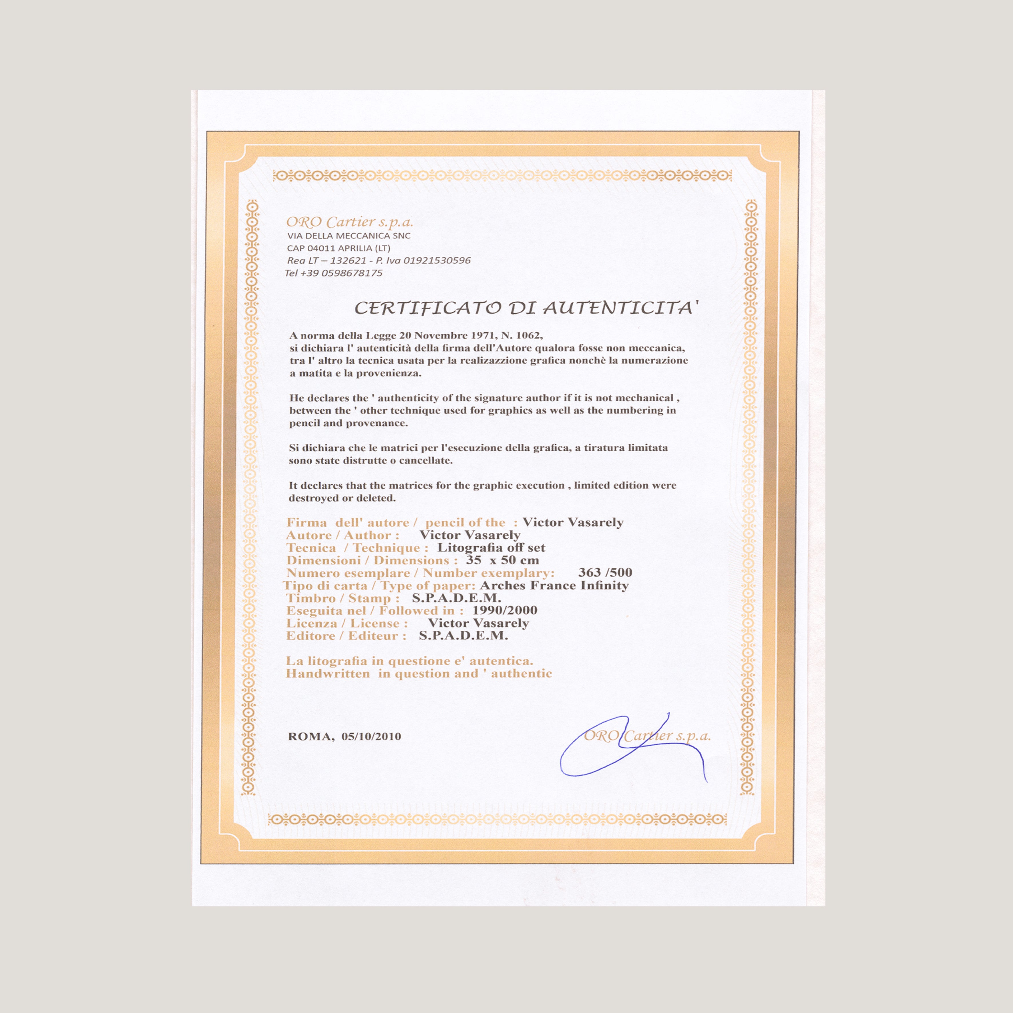 Grafický list 35x50 cm v limitovaném nákladu. Tisk č. 363/500. Slepotiskové razítko S.P.A.D.E.M. Volný list. Certifikát, ruční papír Arches France Infinity. Licence: Victor Vasarely Museum. Editor: S.P.A.D.E.M.